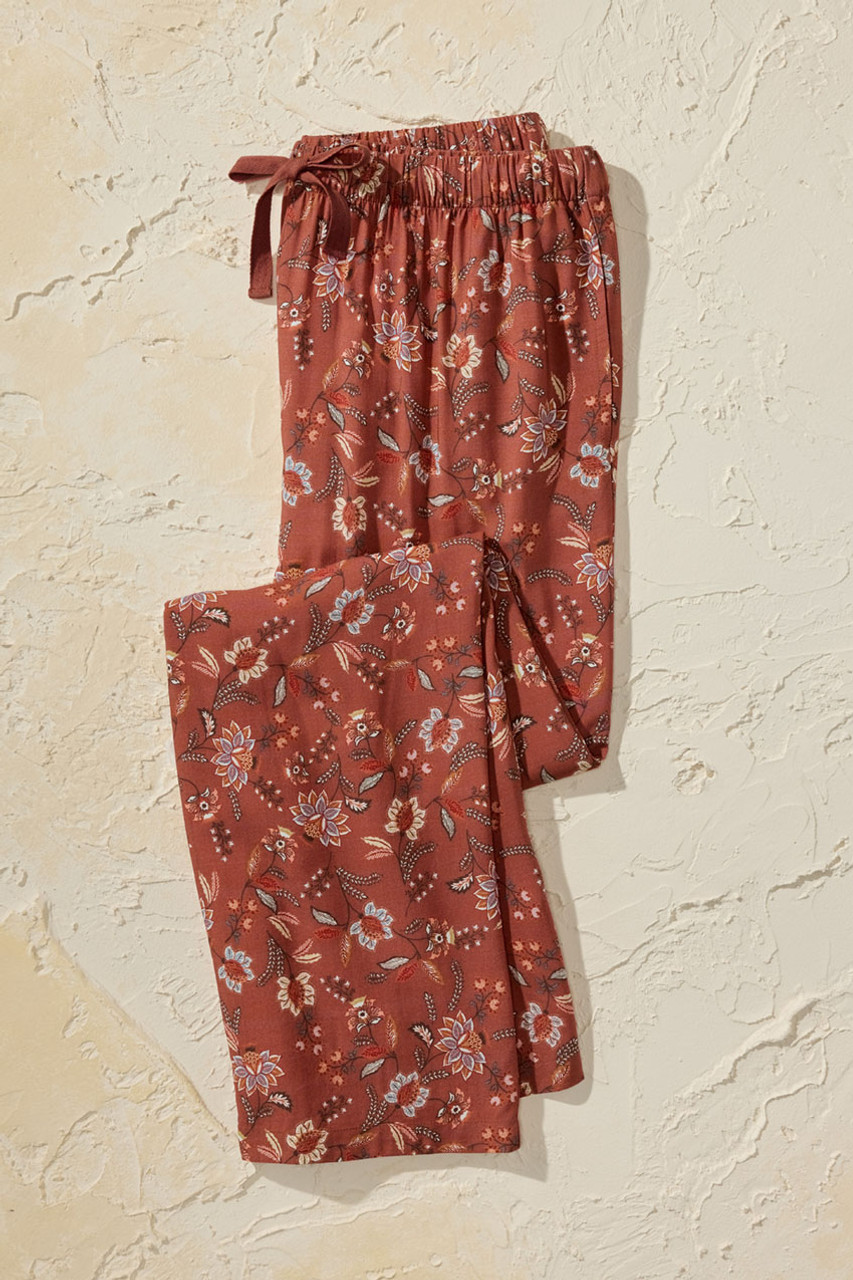 Our easy, lightweight pants offer everyday style, spiced with a print of rich desert florals. Pull-on style is smooth and drapey, with an elastic drawstring waist and on-seam pockets.